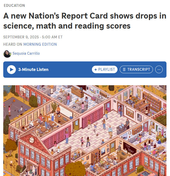 New test scores from the National Assessment of Educational Progress (NAEP), also known as the Nation's Report Card, show eighth-graders' science scores have fallen 4 points since 2019 and 12th-graders' math and reading scores have fallen 3 points in the same time period.