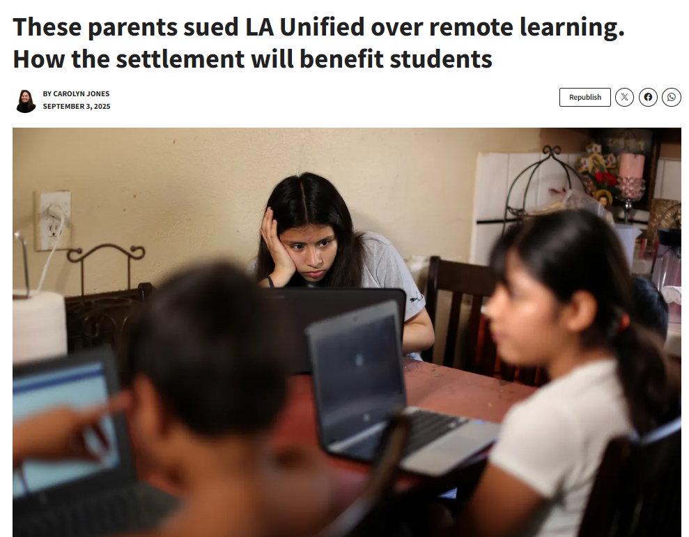 The settlement, filed in Los Angeles County Superior Court, was announced Wednesday by the law firm representing families who said their children fell disastrously behind during the Covid-related school shutdown in 2020-21.  (Source:  CalMatters -- Read more ...)
