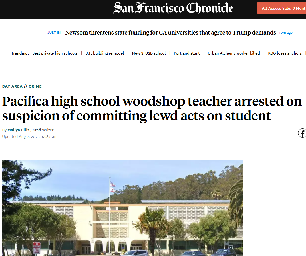 Pacifica High School Woodshop Teacher Arrested on Suspicion of Committing Lewd Acts on Student