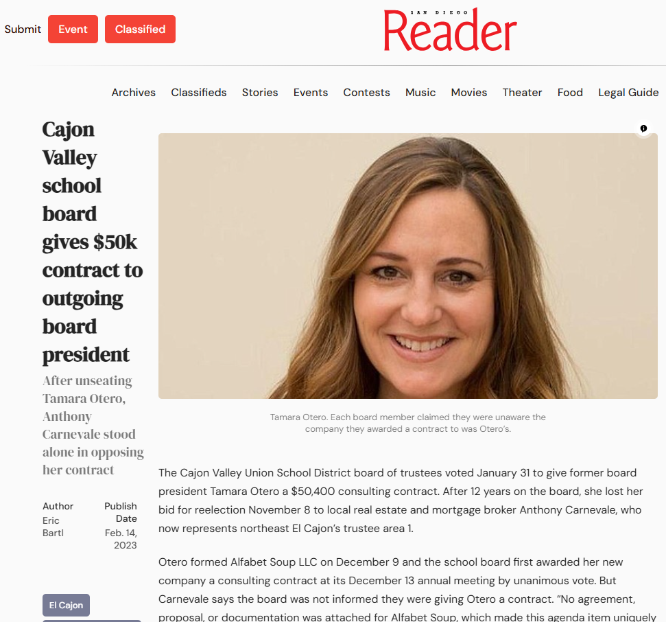 The Cajon Valley Union School District board of trustees voted January 31 to give former board president Tamara Otero a $50,400 consulting contract. After 12 years on the board, she lost her bid for reelection November 8 to local real estate and mortgage broker Anthony Carnevale, who now represents northeast El Cajon’s trustee area 1. (Source: San Diego Reader - Read more)