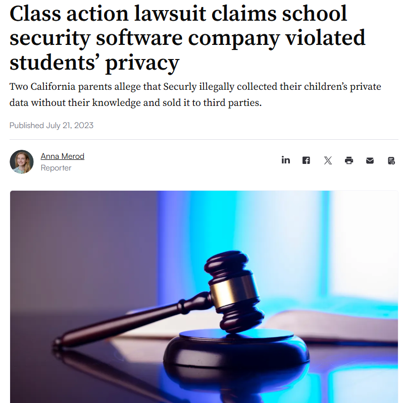 Parents of two California students this week filed a class action lawsuit alleging that school security software company Securly illegally collected students’ private information without their consent and sold it to third-party vendors.