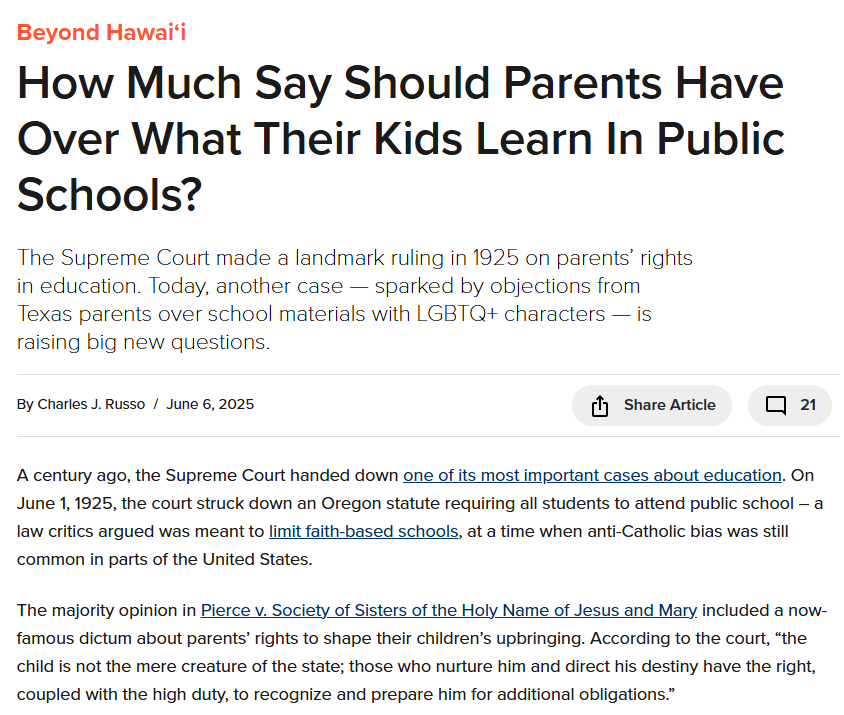 The Supreme Court made a landmark ruling in 1925 on parents’ rights in education. Today, another case — sparked by objections from Texas parents over school materials with LGBTQ+ characters — is raising big new questions. (Source: CivilBeat.org -- Read more ...)