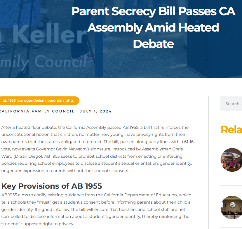 After a heated floor debate, the California Assembly passed AB 1955, a bill that reinforces the unconstitutional notion that children, no matter how young, have privacy rights from their own parents that the state is obligated to protect. The bill, passed along party lines with a 61-16 vote, now awaits Governor Gavin Newsom’s signature. Introduced by Assemblyman Chris Ward (D-San Diego), AB 1955 seeks to prohibit school districts from enacting or enforcing policies requiring school employees to disclose a student’s sexual orientation, gender identity, or gender expression to parents without the student’s consent.  (Source:  California Family Council -- Read more ...)
