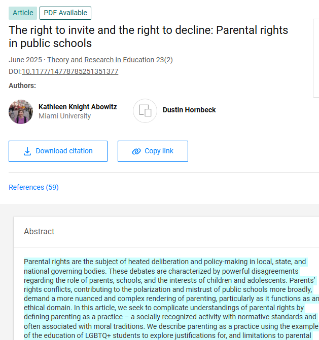 Parental rights are the subject of heated deliberation and policy-making in local, state, and national governing bodies. These debates are characterized by powerful disagreements regarding the role of parents, schools, and the interests of children and adolescents. Parents’ rights conflicts, contributing to the polarization and mistrust of public schools more broadly, demand a more nuanced and complex rendering of parenting, particularly as it functions as an ethical domain. In this article, we seek to complicate understandings of parental rights by defining parenting as a practice – a socially recognized activity with normative standards and often associated with moral traditions. We describe parenting as a practice using the example of the education of LGBTQ+ students to explore justifications for, and limitations to parental rights claims.  (Source:  Research Gate -- Read more ...)