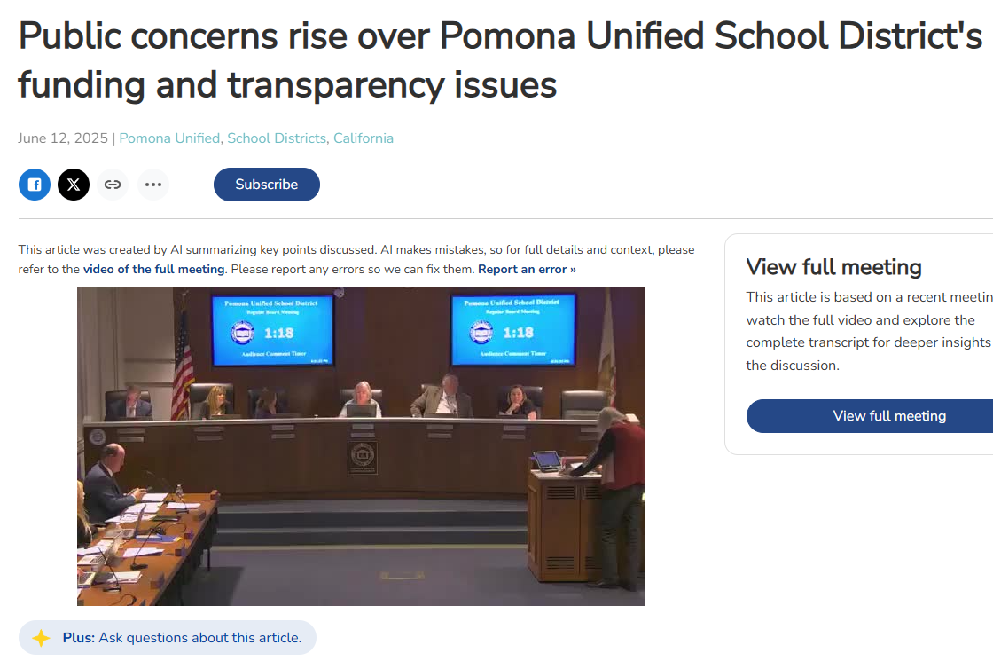 The Pomona Unified School District (PUSD) Board meeting on June 11, 2025, highlighted significant concerns regarding transparency and fiscal management within the district. Community members voiced urgent calls for accountability, particularly in light of the district's handling of substantial bond measures totaling nearly $920 million over the past 16 years. (Source - CitizenPortal.ai -- Read more ...)