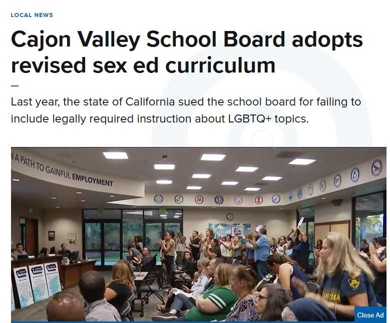 EL CAJON, Calif. — The Cajon Valley Union School District school board voted to adopt a revised sexual health education curriculum, bringing the district back into compliance with state standards. The decision comes after the State of California sued the district last year for failing to include legally required instruction about LGBTQ+ topics.  (Source:  CBS8 - Read more ...)