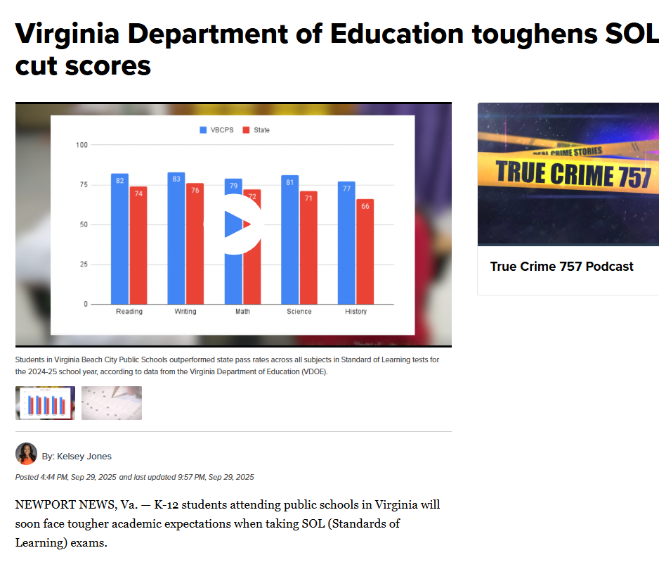 The Virginia Board of Education recently voted to raise SOL cut scores — the minimum scores needed to pass — in reading and math. (Source: WTKR News 3 - Read more ...)